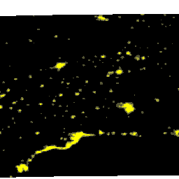 Compuesto anual de imágenes nocturnas de Andalucía generado a partir de imágenes del satélite DMSP-F12, captadas por el sensor OLS. Corregido geométricamente, remuestreado a 100m de resolución. Año 1996.