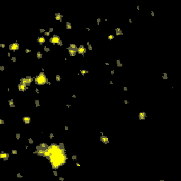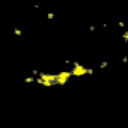 Compuesto anual de imágenes nocturnas de Andalucía generado a partir de imágenes del satélite DMSP-F15, captadas por el sensor OLS. Corregido geométricamente, remuestreado a 100m de resolución. Año 2004.