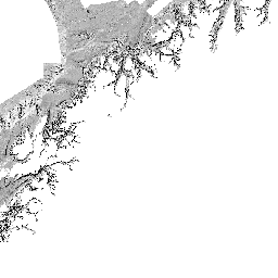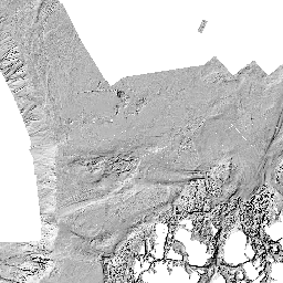 Svarthvit skyggerelieffkart basert på 10m dybdegrid. Topografien er belyst fra NV (315 grader) og med solhøyde på 45 grader over horisonten.